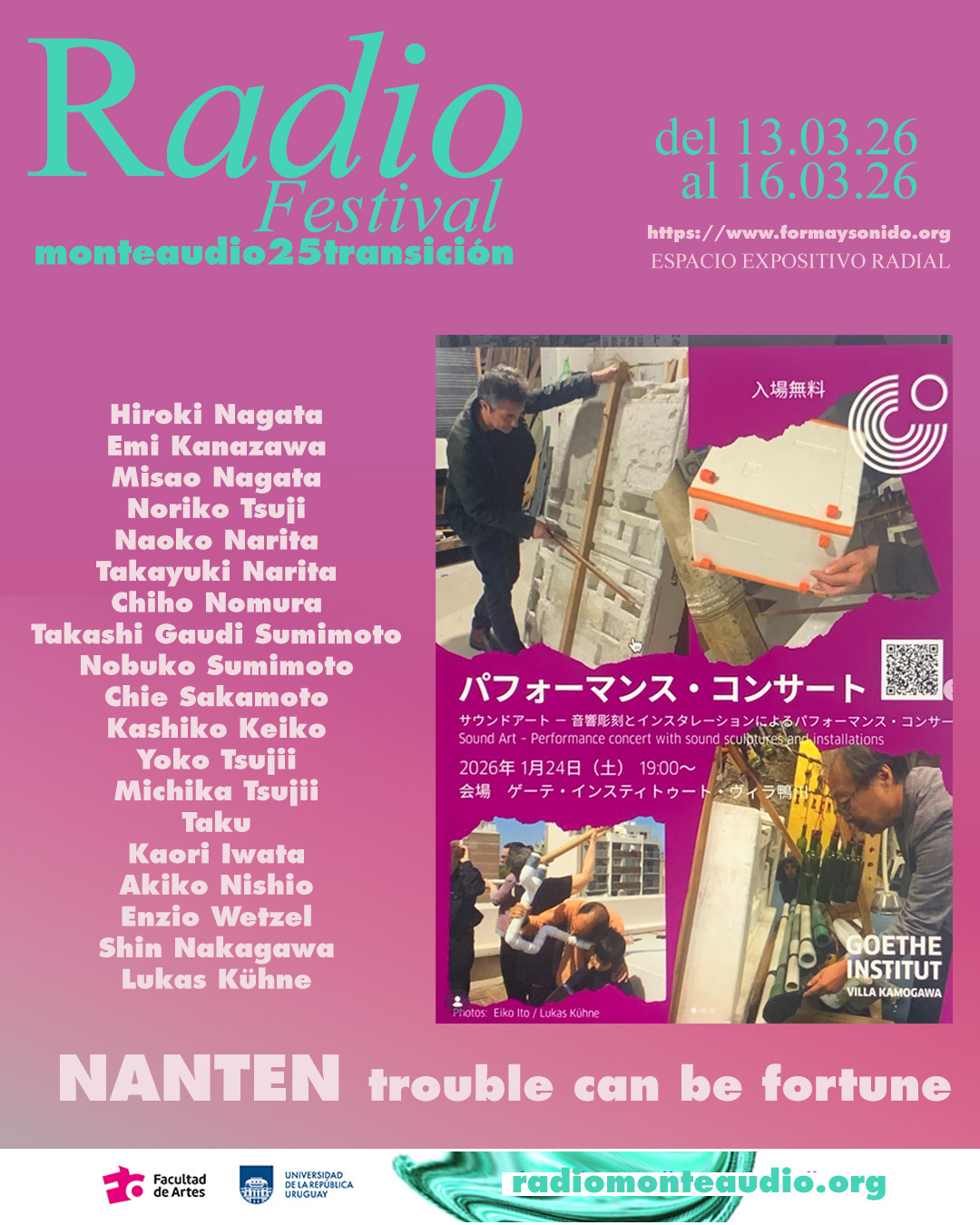 Once participantes de diferentes ámbitos —artistas plásticos contemporáneos, cantantes, actores, artistas sonoros, escultores, intérpretes de gamelán, profesores universitarios, estudiantes y dos becarios de la Villa Kamogawa— se reunieron para este fin en la sala de conciertos en la Villa Kamogawa del Instituto-Goethe de Kioto, Japón.